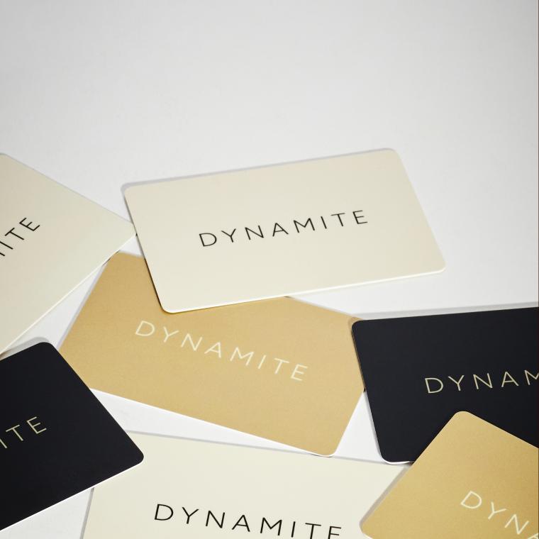 Dynamite gift cards are available for purchase in-store and at dynamiteclothing.com, while e-gift cards can only be bought online. They can also be found at authorized retailers. Please note, Dynamite gift cards and e-gift cards cannot be used to purchase other gift cards or e-gift cards.